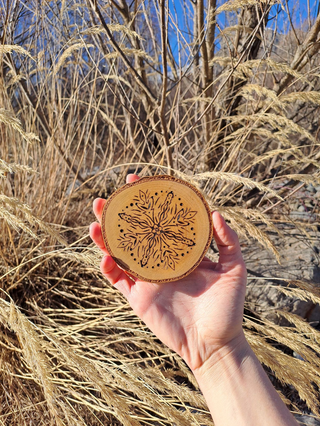 Pyrogravure originale fait main sur rondelle de bois de bouleau.